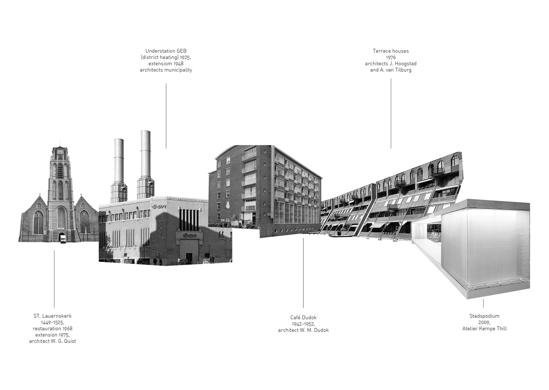 The grote kerkplein is one of the special squares in Rotterdam that is surrounded by a rare history of architecture. The district heating building, Dudok and S.t Laurenskerk reflect the richness of Dutch techniques in the history of the brick.